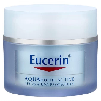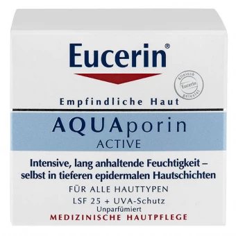 Die Eucerin AQUAporin ACTIVE Feuchtigkeitspflege mit LSF 25+ UVA-Schutz sorgt für einen strahlenden Teint, eine geschmeidig-weiche Gesichtshaut mit hoher Elastizität und schützt vor schädlichen UV-Strahlen. Tieferliegende Hautschichten werden intensiv mit lang anhaltender Feuchtigkeit versorgt, was zu einer Stärkung der Hautbarriere und Aktivierung des hauteigenen Feuchtigkeitnetzwerks führt. Die unparfümierte und parabenfreie Formel ist für alle Hauttypen geeignet und versorgt auch empfindliche Haut mit Feuchtigkeit. Sie zieht schnell ein und ist deshalb ideal als Make-up Grundlage.