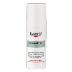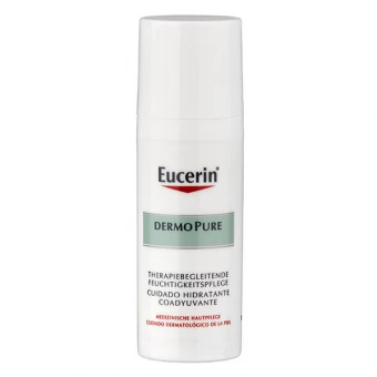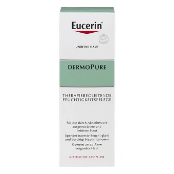 Eucerin Dermopure Therapiebegleitende Feuchtigkeitspflege unterstützt die Haut bei medikamentöser Aknetherapie Die Eucerin Dermopure Therapiebegleitende Feuchtigkeitspflege dient der Pflege der Gesichtshaut während einer Aknetherapie. Sie mildert Irritationen, Trockenheit, Spannungen und Rötungen der Haut als Folge einer medikamentösen Aknebehandlung. Antibakterielle und entzündungshemmende Eigenschaften beugen Hautinfektionen vor. Zur Kontrolle unreiner Haut wird diese von der Creme lang anhaltend mit Feuchtigkeit versorgt und eine funktionierende Hautbarriere gefördert. Die Formel fettet nicht, ist frei von Parfüm und nicht komedogen, um die Haut nicht zu reizen. Eucerin Dermopure Therapiebegleitende Feuchtigkeitspflege ist für alle Hauttypen geeignet und kann auch bei empfindlicher Haut angewendet werden. Ein Einsatz während der Schwangerschaft ist problemlos möglich. Durch klinische und dermatologische Studien wurde eine hervorragende Hautverträglichkeit und Pflegewirksamkeit bewiesen.