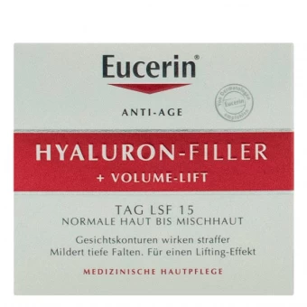 Eucerin HYALURON-FILLER + VOLUME-LIFT Tagespflege für normale Haut bis Mischhaut wurde speziell auf die Bedürfnisse normaler und Mischhaut mit Volumen- oder Konturverlust abgestimmt. Magnolol steigert Größe und Menge volumengebender Hautzellen, Oligo Peptide stimulieren das Kollagennetzwerk. Hyaluronsäure versorgt die Haut intensiv mit Feuchtigkeit und vermindert die Faltentiefe.