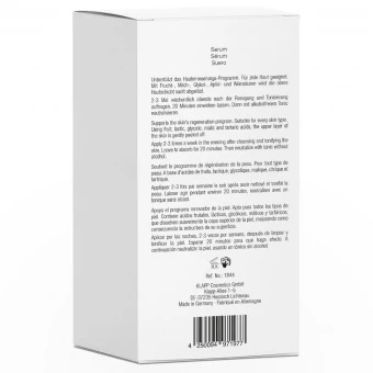 Unterstützt das Hauterneuerungs-Programm. Für jede Haut geeignet. Mit Frucht-, Milch-, Glykol-, Apfel- und Weinsäuren wird die obere Hautschicht sanft abgelöst. In Folge verfeinert sich die Hautoberflächenstruktur: Müde, graue, stumpfe, raue, dicke, grobporige, faltige, unreine, verhornte, braunfleckige Haut verbessert sich. Eine neue, zarte, rosige, frische, strahlende und glatte Haut kommt zum Vorschein.